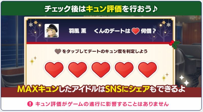 | MAXキュンしたアイドルはSNSにシェアもできるよ キュン評価がゲームの進行に影響することはありません | |