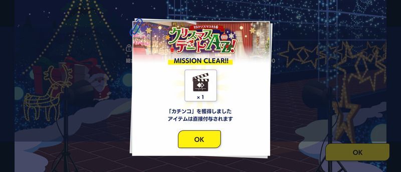 毎日更新のミッションクリア報酬の「カチンコ」を使用するとアイドルのクリスマスデートプランをチェックでき、一定数のアイドルのプランをチェックするたびにストーリーが進行します♪