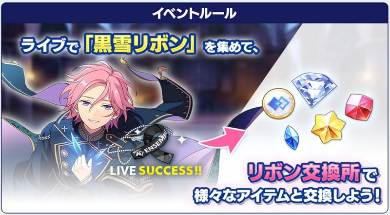 ライブ達成時に確定ドロップする「黒雪リボン」を一定数集めると「リボン交換所」よりダイヤや各色ステータスピース、育成チケット、ESコイン、L$(リッドル)など様々なアイテムと交換できます。