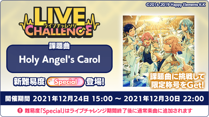 ライブチャレンジ課題曲「Holy Angel’s Carol」の難易度Special(スペシャル)に挑戦すると、目標達成およびランキング報酬として称号を獲得できます。