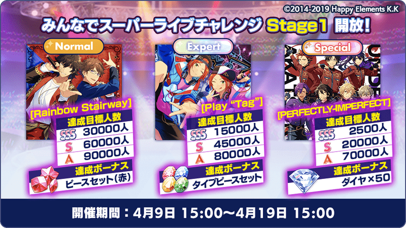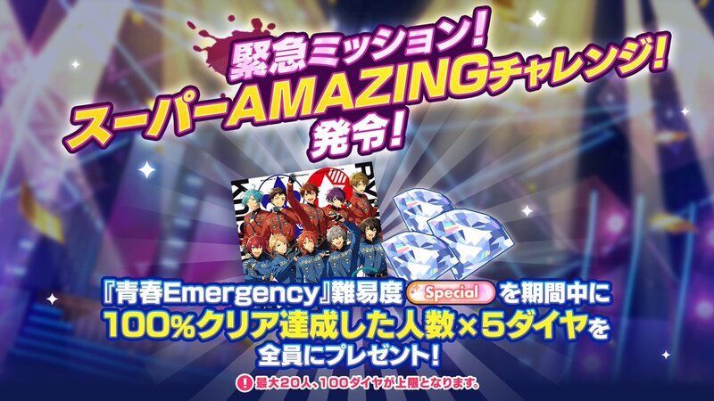 期間中にStage3の課題曲「青春Emergency」をチャレンジレート100%でクリアした人数×ダイヤ5個を後日、全プロデューサーにプレゼントします。