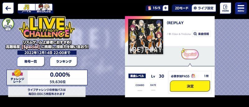ライブチャレンジ課題曲「(RE)PLAY」の難易度Special(スペシャル)に挑戦すると、目標達成およびランキング報酬として称号を獲得できます。