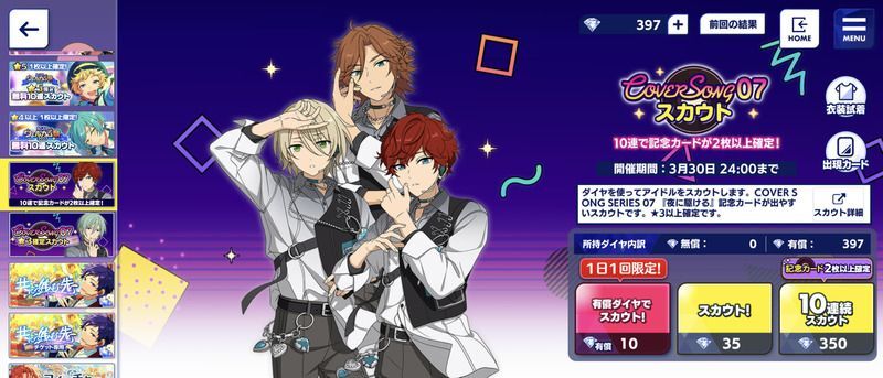 | 報酬 | COVER SONG 07 ☆3確定スカウトチケット×1 | |