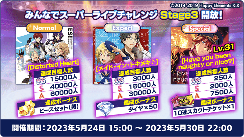期間中にStage3の課題曲「Have you been naughty or nice?」をチャレンジレート100%でクリアした人数×ダイヤ5個を後日、全プロデューサーにプレゼントします。