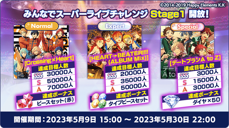 期間中、各楽曲のチャレンジレートが「A」 「S」「SSS」に到達した人数が目標数を突破すると、曲ごとにボーナスを獲得できます。
