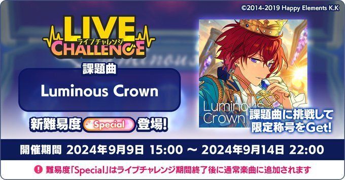 ライブチャレンジ課題曲「Luminous Crown」の難易度Special(スペシャル)に挑戦すると、目標達成およびランキング報酬として称号を獲得できます。