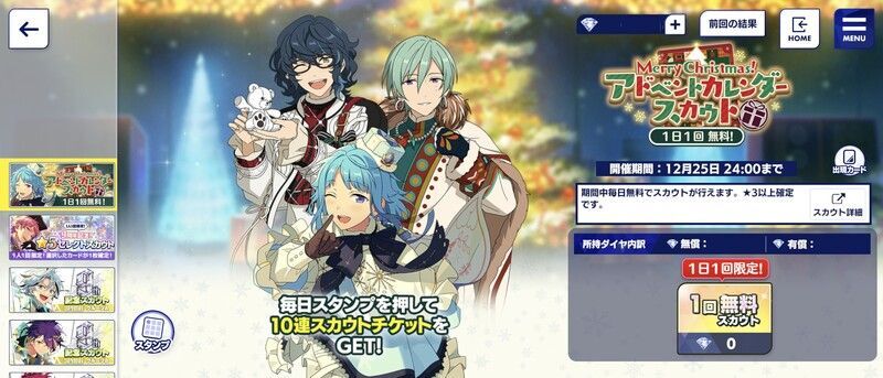 スカウトを引くと、クリスマスアドベントカレンダーにスタンプが押され、スタンプの個数に応じて「メリークリスマス10連スカウトチケット」など豪華なクリスマスボーナスをGETできます!