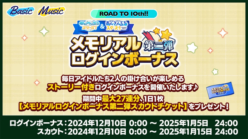 | チケット 配布期間 | 2024年12月10日 0:00 ~ 2025年01月05日 23:59 ※期間中のログインで最大27枚 |