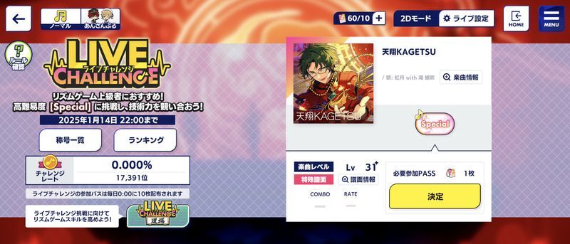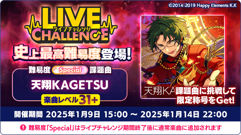 ライブチャレンジ課題曲「天翔KAGETSU」の難易度Special(スペシャル)に挑戦すると、目標達成およびランキング報酬として称号を獲得できます。