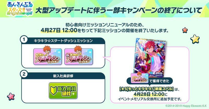 初心者向けミッションリニューアルのため、「キラキラ☆スタートダッシュミッション」「超!キラキラ☆スタートダッシュミッション」「新入社員研修」が終了します。