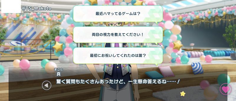 | 1ナイス 2回目 | ボイス「誕生日(祝ってもらった) - 6」 【衣更 真緒・真白 友也・朱桜 司・神崎 颯馬のみ】 ボイス「誕生日(祝ってもらった) - 7」 【エス・滝 維吹・カンナ・ユメ・ライカのみ】 ボイス「誕生日(祝ってもらった) - 2」 |