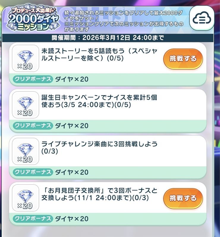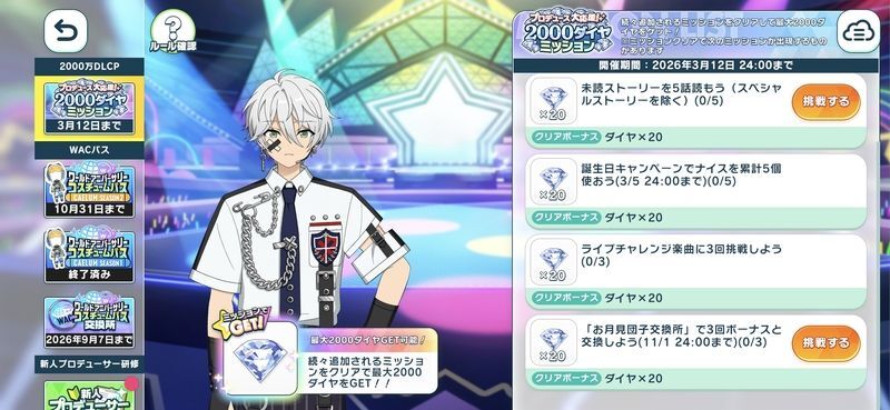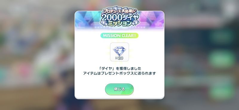 | ホーム画面左下の「CAMPAIGN」アイコンから「2000万DLCP」>「プロデュース大応援!2000ダイヤミッション」へアクセスし、ミッションを確認してください。 ▶ミッション一覧情報はこちら | |