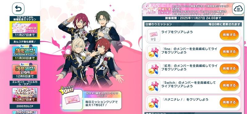 | ホーム画面左の「CAMPAIGN」>「スタフォニ4th開催記念ミッション」より、ミッションを確認してください。 | |