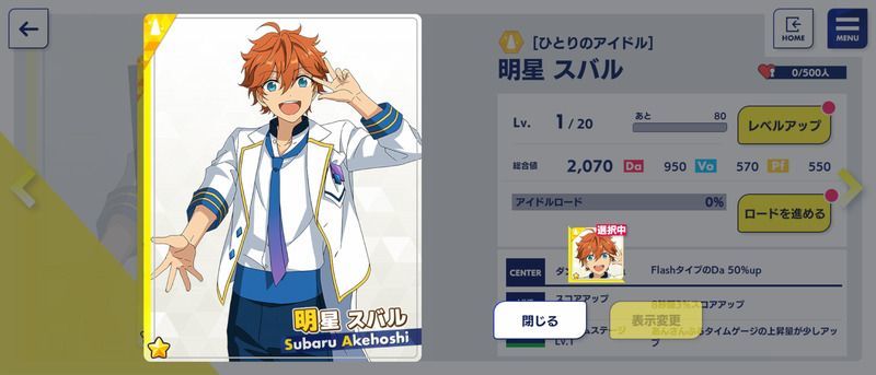 『リズムゲーム版あんスタ(あんさんぶるスターズ!!Music)』☆1「[ひとりのアイドル]明星 スバル」のカード情報ページです。ステータスや追加日、アイドルロード情報などを掲載しています。