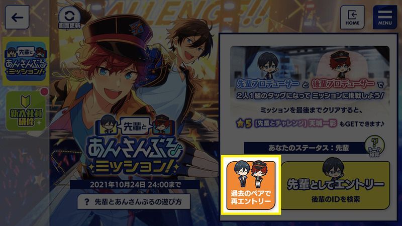 | 「先輩とあんさんぶるミッション」を過去にクリアしたことがある場合、キャンペーン画面で「過去のペアで再エントリー」を選べます。 | |