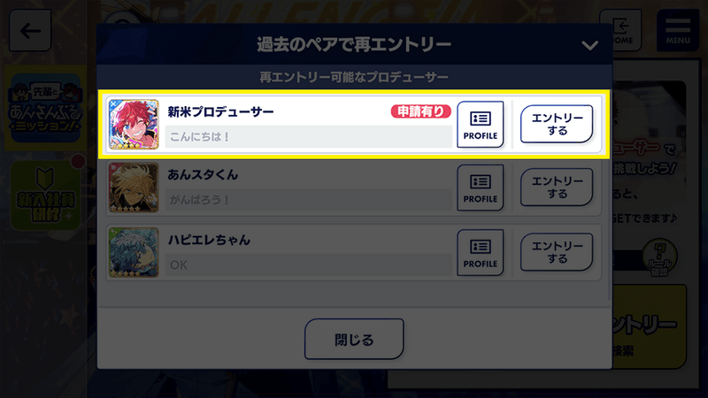 - ゲーム内の「過去のペアで再エントリー」より先輩プロデューサーのエントリーをお待ちください。