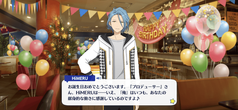 | 『プロデューサー』、お誕生日おめでとう! 『プロデューサー』がいてくれてるからこうして楽しい毎日が送れてるんだぜ~♪ | |