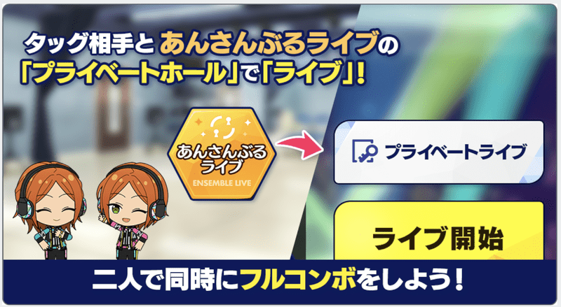 | クリア方法 | あんさんぶるライブのプライベートホールで、タッグ相手と同時にフルコンボをしよう! | ||