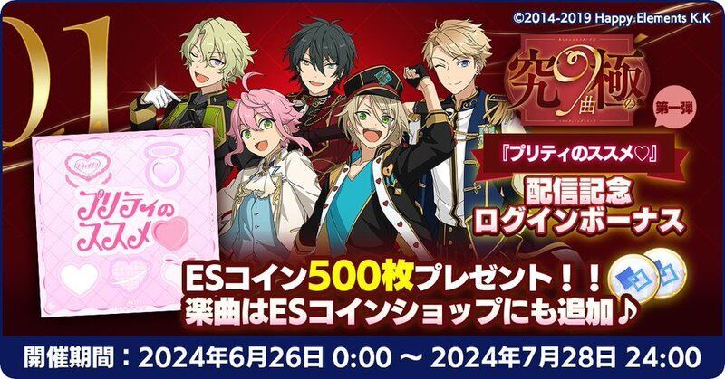 バラエティソングシリーズ究極の9曲 第一弾『プリティのススメ♡』の全世界一斉配信を記念してESコイン×500がプレゼントされます。