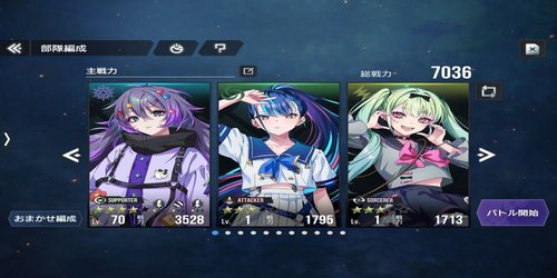 ステージを選択し、編成を確認後バトル開始ボタンを押すと戦闘が始まる。3つのスキルを活用して攻略する。そしてバトル終了後は勝てば報酬とミッションの成果、負ければガチャや強化画面へ移動するボタンが出現する。