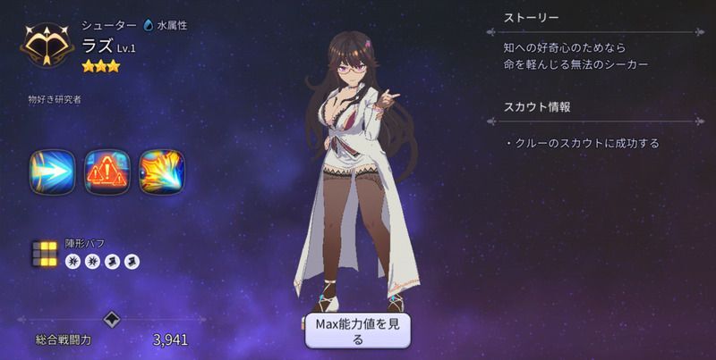 水属性シューターのラズはサポートが得意なタイプで相手に「マインドバグ」のデバフを付与し、防御や会心回避率ダウン、付与中に受けたダメージに応じて解除時にダメージを与えます。