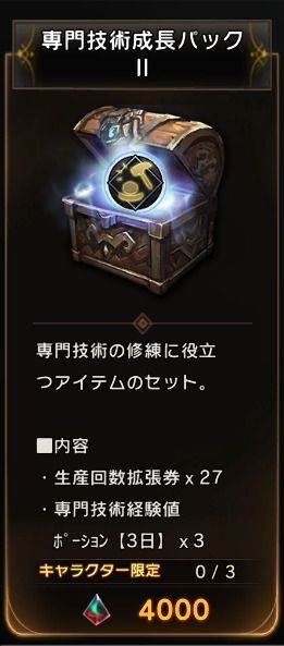| 生産回数拡張券9枚と、採集や生産での専門技術経験値獲得率が3日間100%上昇するポーションのパック。 | |