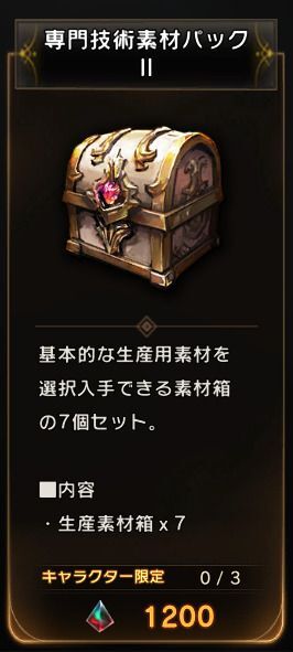 | (【素材ボックス】カテゴリーで販売されていた)生産素材箱が装いも新たに登場! 生産素材箱(2)を1つにまとめました! 選択した素材100個が手に入る、鍛冶、裁縫、革細工、錬金術 いずれかの「生産素材箱(2)」を選択して入手できます。 | |