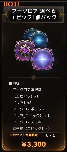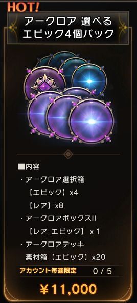 | エピックとレアのアークロアを選択入手!ラインナップからお好きなアークロアを選べるアークロア選択箱と、アークロア強化素材が入った箱をセットにしたパック。 | |