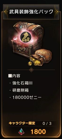 | 強化石100個と研磨剤50個が手に入る2種類の箱に、18万ゼニーが付いたパック。 | |