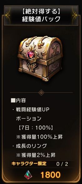 | ブラックストーン1800個と、7日間有効な戦闘経験値UPポーション1個が付いた商品。戦闘経験値UPポーションは、敵を倒したときの経験値獲得量が200%上昇する。 | |