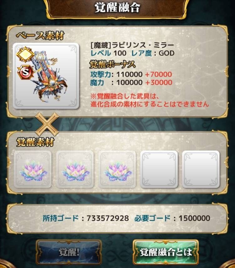 ①限界覚醒融合は、特定の武具のみ行うことができます。→限界覚醒を行える武具