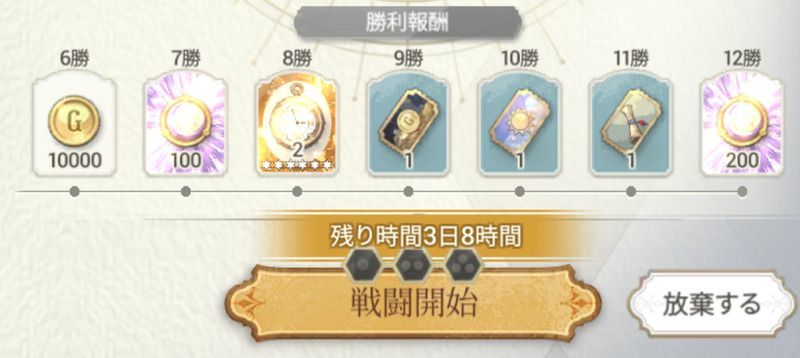 闘技場で勝利を重ねると報酬でゼスを獲得できます。闘技場はランダムに選ばれる陣形・キャラを用いて勝ち進むコンテンツなので、あまりキャラを持っていない方でも十分に遊ぶことができます。
