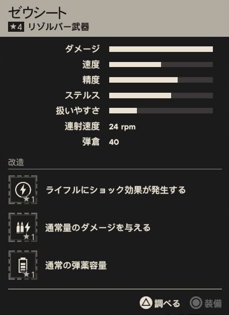 | 改造1 | ・「通常電圧(★1)」 ライフルにショック効果が発生する ・「増強電圧(★4)」 ビークルに与えるライフルのショック効果の持続時間が延長される (要改造・必要素材:火薬x1、リサイクルネジx8) | ||