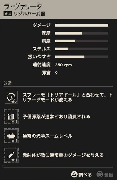 | 改造1 | ・「通常弾薬消費(★1)」 予備弾薬が通常どおり消費される ・「キラーコベナント(★4)」 トリアーダモードでヘッドショットを決めると残弾数が減らない (要改造・必要素材:火薬x1、リサイクルネジx8) | ||