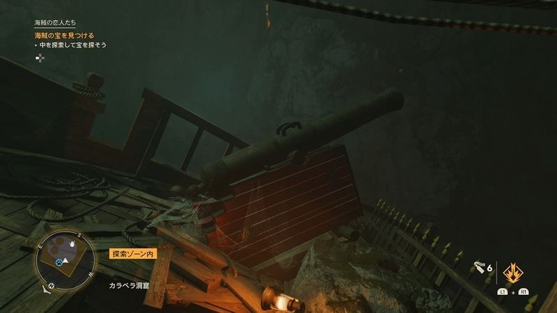 | ・入口の木を破壊して中へ ・階段を上り上へ ・グラップル、先に進み外へ ・先に進み洞窟内階段降りる ・下に水があるので飛び降りてもOK ![]() ・マストにグラップルで船に ・大砲にインタラクト、壁が壊れる ・グラップルで戻り先に進むと宝箱 ![]() | |