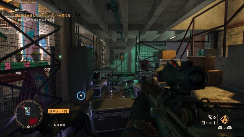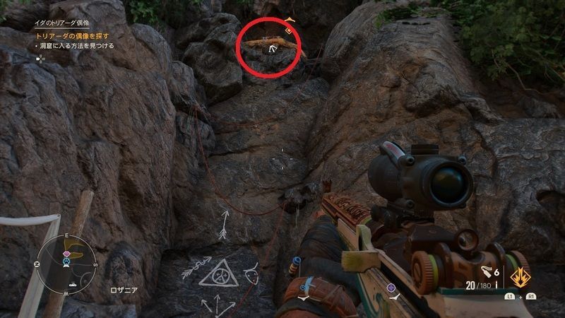| ・岩に付いたオレンジの印を目印に登っていく ・ジャンプで先に進んでいく ・グラップリングで登る ・洞窟に入り、グラップリング ![]() ・下に水たまりがある手前で左壁登る ・右壁へジャンプ ・グラップリングで先に進む ・ツタを切って外へ ・先へ進み、赤いネットを銃で撃ち壊す ・物資を回収する | |