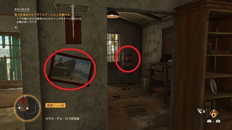 ![]() ![]() ①ラジオ付ける ②しゃがんでテレビ付ける ③壁の写真を調べる ・隠し部屋でレバー操作 ![]() ・近くの黄色タンクバルブで毒止める ・建物に入って進む ・レバー操作 ![]() ・近くにある建物?の屋根へ ・塀の上を進み、青い布へジャンプ ・レバー操作 ・最初の建物に戻る | |