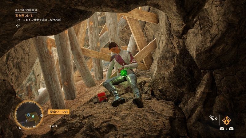 ![]() ・洞窟内を進み、グラップルで上へ ・グラップルで進み博士の所へ 「不幸の頭蓋骨」入手 ![]() ・壁が壊れる、次の目的地へ向かう ・洞窟内を進み、行き止まりで頭蓋骨をかざす ![]() ![]() ・先に進む、ワニ多いので注意 ・右側の階段を進み、石像に頭蓋骨をかざす ・左側へグラップルで渡り頭蓋骨をかざす ・右側上に通路ができるので進む ・入った直後、毒エリア ・先に進み上に登る ・先に進む(ワイヤートロップ2箇所) ・宝に向かってジャンプ | |
