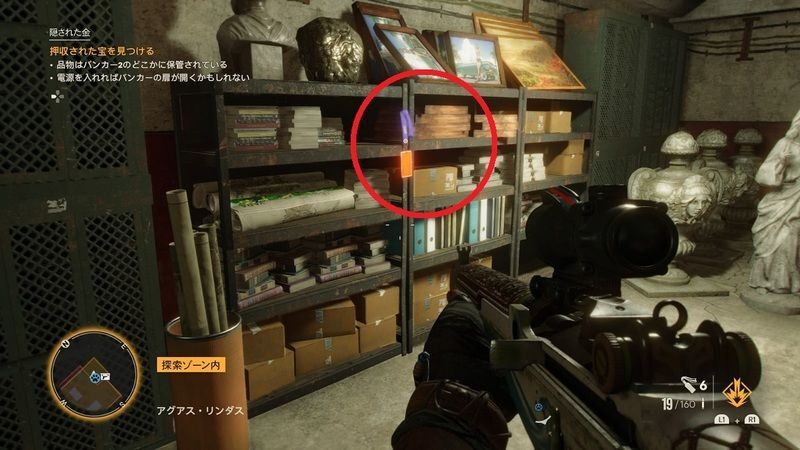 | ・洞窟に入り進む ・天井にあるミラーボールにグラップル ![]() ・上に行きレバーで電源を入れる (感電ダメージに注意) ・扉から中には入り、上に進む (オレンジの部分を目印にジャンプ) ・先に進み、下に降りたら隣の部屋でグラップル ・タイミングをはかって先にジャンプ ・DJブース箱:ハンドガン「1911」 ![]() | |