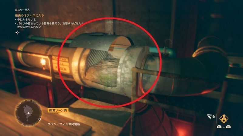 | ・中には入り、先に3つの小さなバルブ回す ・緑ランプ3つ点いたら大きなバルブ回す ![]() ![]() ![]() ・タンクが壊れるので、その先天井へグラップル ・しゃがんで先に進む ・下に降りてオフィスへ | |