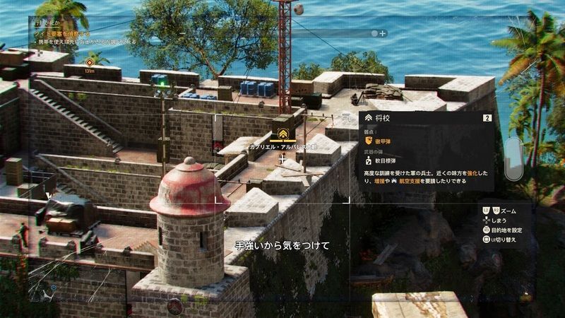 | ・ハシゴを上り屋上へ行く ・クイト要塞を偵察する(十字キー上) ・要塞にいるアルバレス大尉をマーキングする (弱点:徹甲弾) ![]() | |