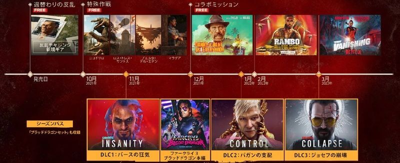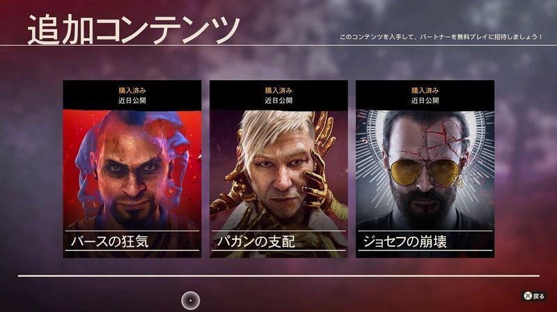 | 発売後のDLCロードマップが公開 -EP1:「バースの狂気」 11月16日配信 単体1980円 -ファークライ3:ブラッド ドラゴン 12月16日配信 単体1980円 -EP2:「パガンの支配」1月11日配信 単体1980円 -EP3:「ジョセフの崩壊」2月8日配信 -11/09 特殊作戦:ロス・トレス・サントス開放 -11/22 特殊作戦:プエルタ・デル・エデン開放 -12/16 特殊作戦:マラグア開放 |