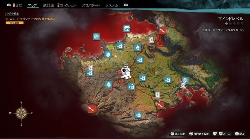 - 基本的にMAP中央(拠点)から伸びている3つの赤い道を辿っていけばシルバードラゴンナイフの場所に行ける
