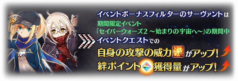 本イベントの期間中、イベントボーナス対象のサーヴァントはイベントクエストにおいて「自身の攻撃の威力がアップ」と「絆ポイント獲得量がアップ」のボーナスが得られます!