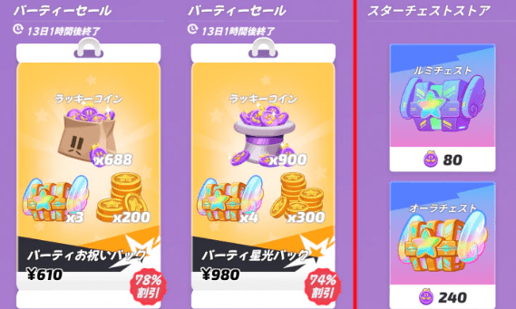 ストアには、ルミチェストやオーラチェストが常に販売されている。また期間限定コーナーに超お得な割引パックが販売されることもあるので、欲しい人はストアを確認してチェストを購入しよう。