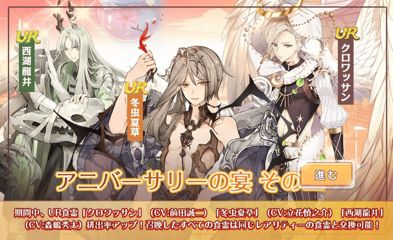 | 内容 | 期間中、新UR食霊「明四喜」(CV:白石兼斗)とSR食霊「ヤンシェズ」(CV:渋谷彗)が排出率アップ!召喚した全ての食霊は同じレアリティーの食霊と交換可能! |