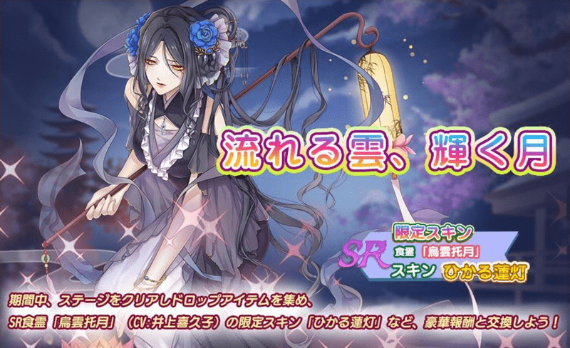| 内容 | 期間中、ステージからドロップしたイベントアイテムを集め、SR食霊「烏雲托月」(CV:井上喜久子)の限定スキン「ひかる蓮灯」などの豪華報酬と交換しよう! |
