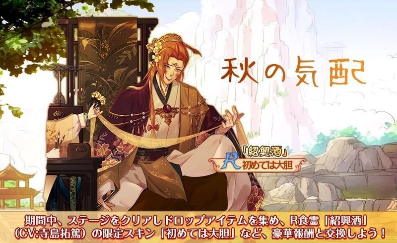 | 内容 | 期間中、ステージからドロップしたイベントアイテムを集め、R食霊「紹興酒」(CV:寺島拓篤)の限定スキン「初めては大胆」などの豪華報酬と交換しよう! |