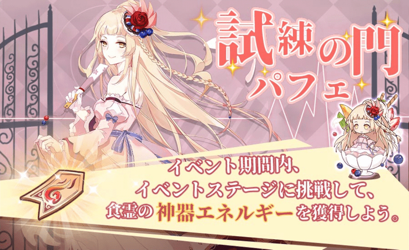 | 内容 | 期間中、召喚からドロップしたアイテムを集め、SR食霊「パフェ」(CV:田中美海)「ヤンシェズ」(CV:渋谷彗)など、豪華報酬と交換しよう |