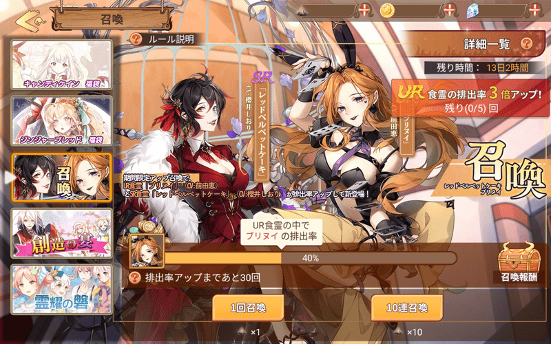 | 内容 | 期間限定アップ召喚で、UR食霊「ブリヌイ」(CV:前田恵)とSR食霊「レッドベルベットケーキ」(CV:櫻井しおり)が排出率アップして新登場! |